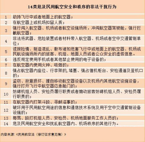 《修订稿》详细列举14类危及民用航空安全和秩序的非法干扰行为。